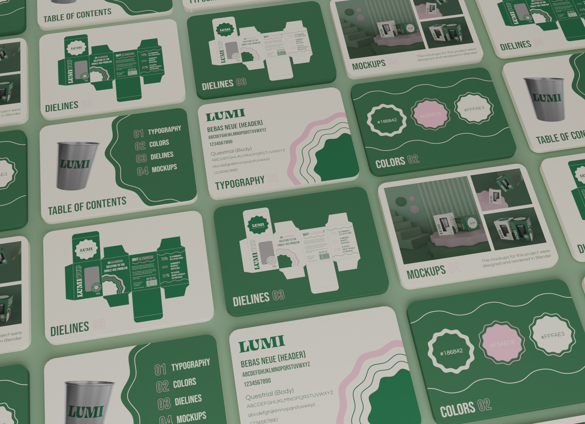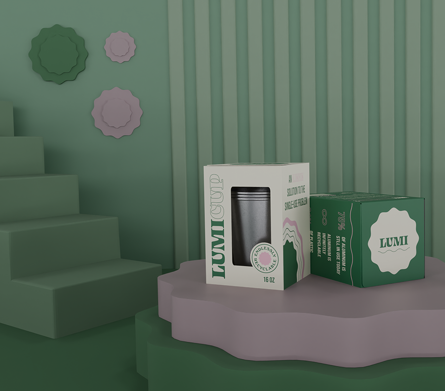 Lumi Cup is an aluminium alternative for single use products. Unlike plastic, aluminum can be endlessly recycled without any loss in quality. This project focused on creating new packaging for the company's 16 oz cup within existing brand guidelines. The packaging mockups were designed in Blender, while the branding and layout for the packaging were designed in Adobe Illustrator.